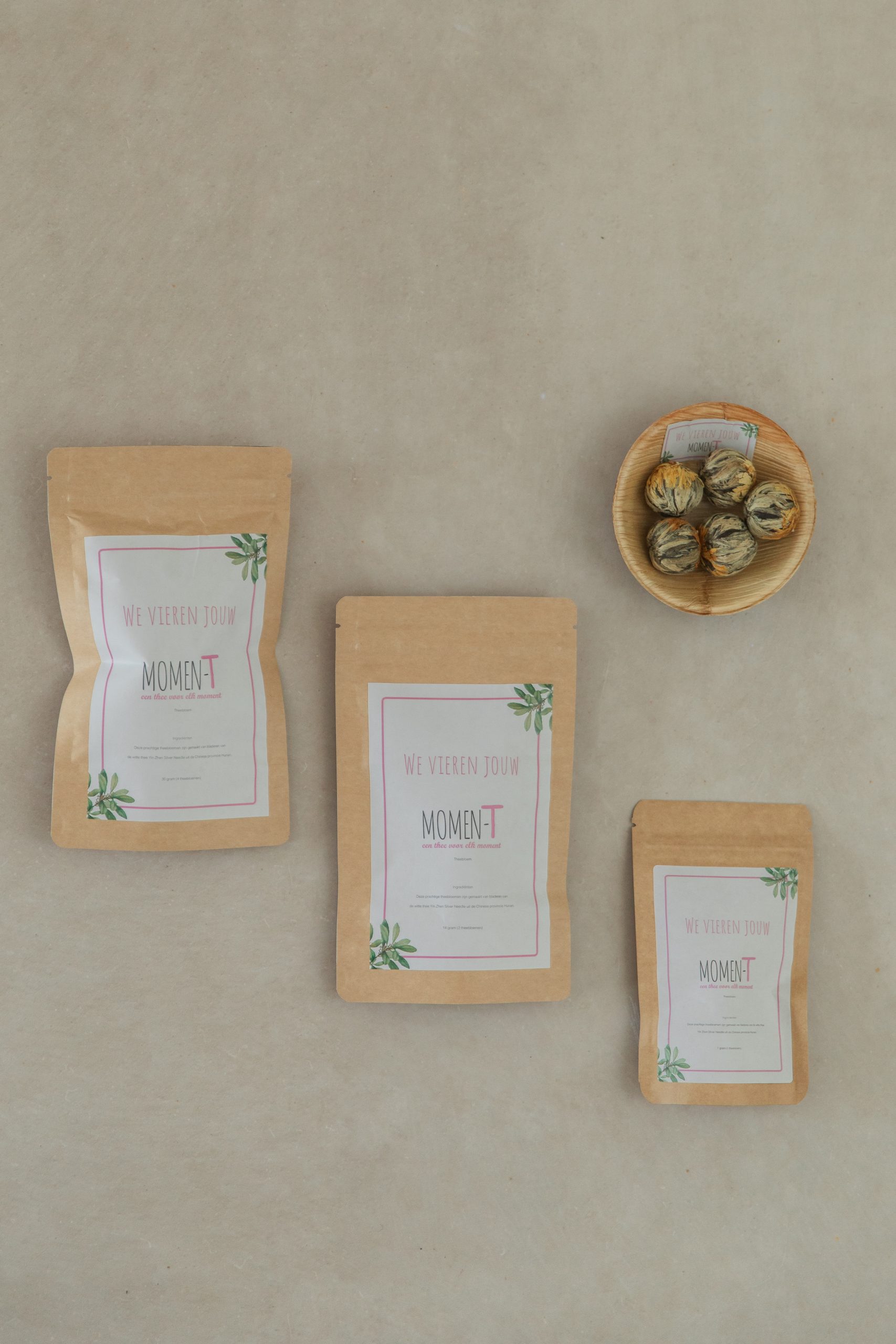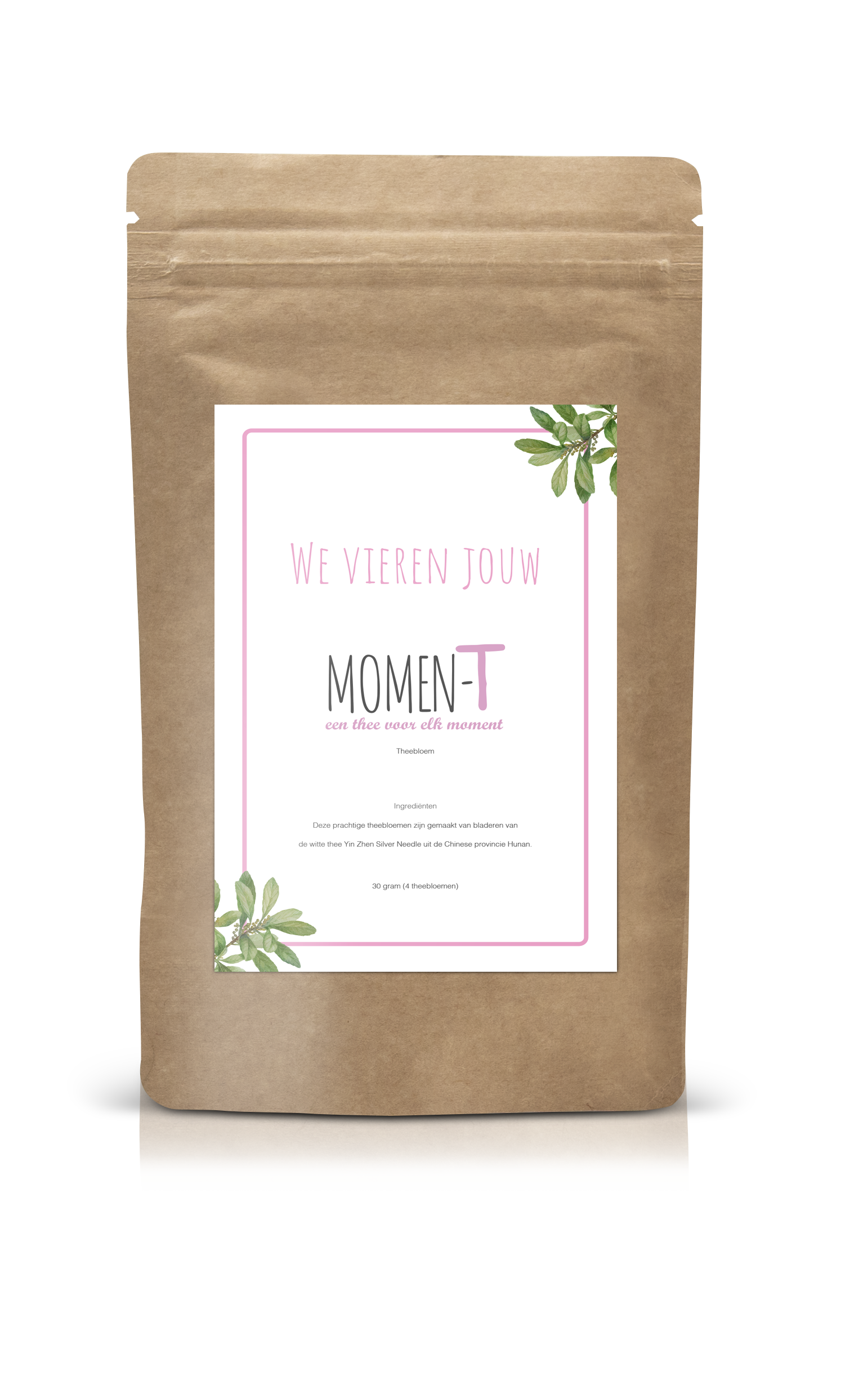 We hebben in ons leven veel momenten die we vieren. Een verjaardag, een bronzen, zilveren of gouden huwelijk, de aan- en/of verkoop van een woning, je nieuwe baan, je diploma. Er zijn wel honderden momenten die het vieren waard zijn. Dat kan met bier en champagne, maar veel beter nog; met een ‘We vieren jouw Momen-T’. Een theebloem waarvan de bloemen gemaakt zijn van witte Yin Zhen Silver Needle. Zodra deze bloem in het hete water wordt gelegd, ontvouwt de bol zich en komen er drie verschillende bloemen tevoorschijn. Naast dat het een verleidelijke heerlijke zoete geur en bloemrijke aroma bevat is het ook een lust voor het oog.